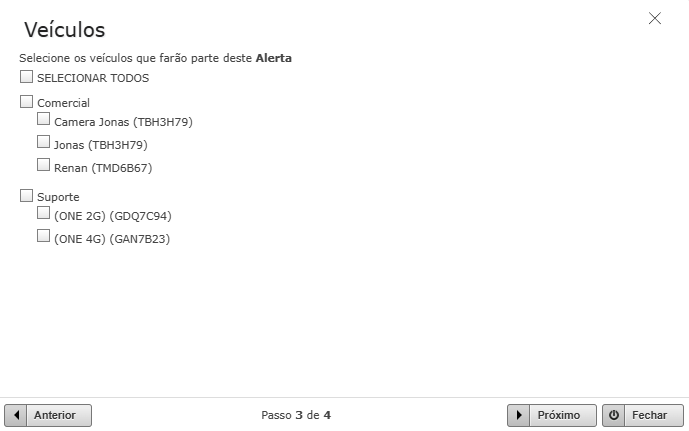Selecione os veículos que farão parte do Alerta.