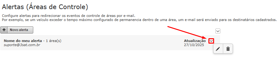 Para editar ou excluir um alerta já criado, acesse a ferramenta e, ao passar o mouse sobre o alerta, clique no botão de Expandir, e em seguida, na opção desejada.