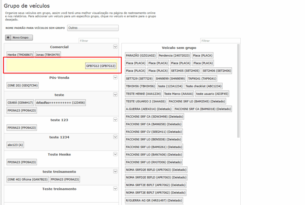 Para vincular um veículo, você pode estar clicando e segurando sobre a placa e arrastando para o grupo desejado até que apareça o retângulo amarelo e assim soltar o botão.