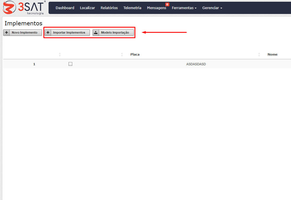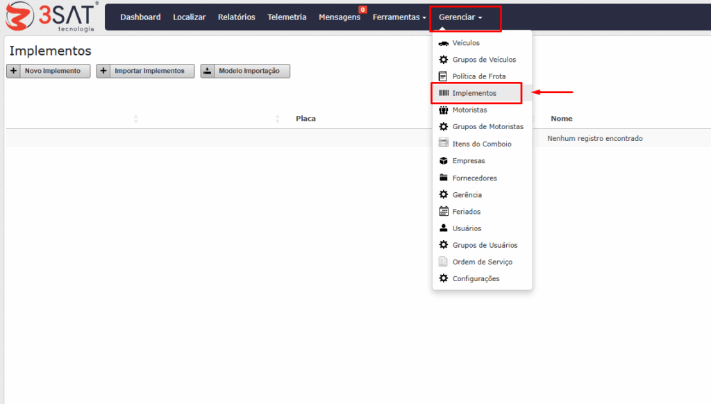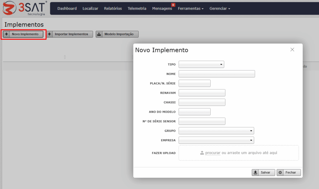 Para cadastrar um implemento basta clicar em “Novo Implemento” e preencher as informações, conforme as informações obrigatórias.